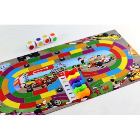 Prin aruncarea zarurilor colorate și mutarea pionilor în funcție de culorile afișate, copiii învață să respecte reguli, să coopereze și să se bucure de joc în echipă.