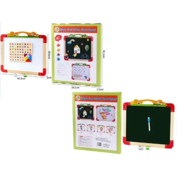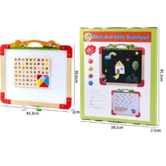 Tablă multifuncțională din lemn cu tablă neagră și magnetică, include cretă, marker, burete, litere și cifre magnetice. Ideală pentru scris, desen și exerciții de matematică, stimulează creativitatea și învățarea prin joacă.